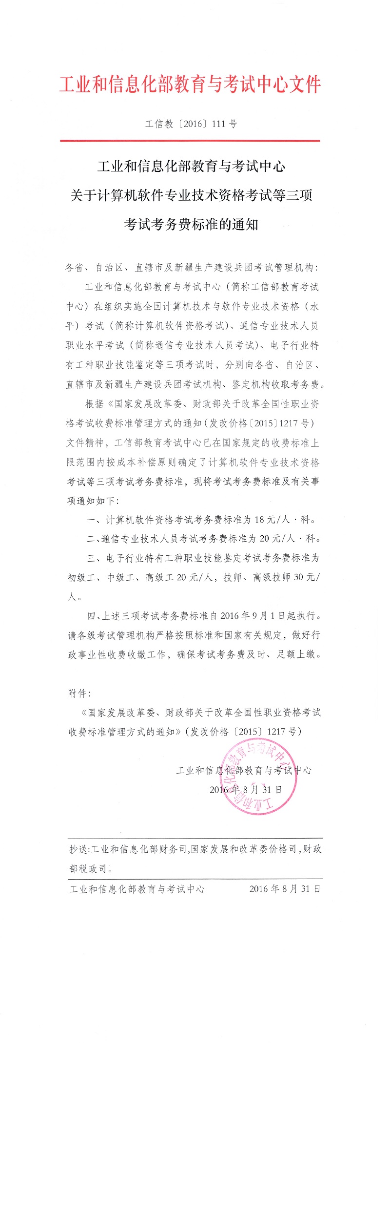 工業(yè)和信息化部教育與考試中心關(guān)于計算機軟件專業(yè)技術(shù)資格考試等三項考試考務(wù)費標準的通知
